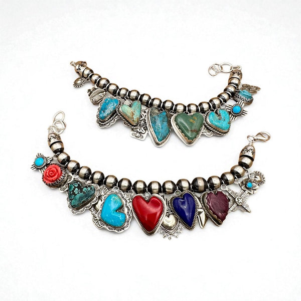 Approx. 7.5 inches of handmade chain with simple hook and eye closure so you can vary size. Stones could vary in color and size as well as stamp designs. Each is one-of-a-kind and has 15 charms including hand cut stone hearts. I use various turquoise, rosarita, coral and sugalite or lapis. If you would like mostly turquoise just let me know. All the charms are my unique designs and made of solid Sterling silver. Made when you order so please allow up to three to four weeks as each heart is hand cut and assembled by hand to become a one-of-a-kind piece.